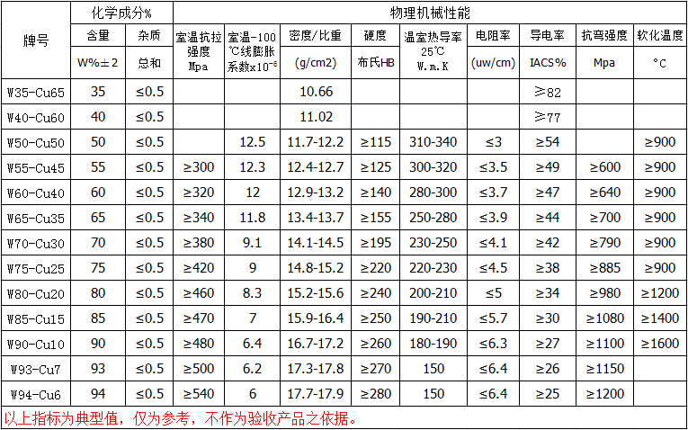 典型鎢銅合金牌號(hào)、性能: